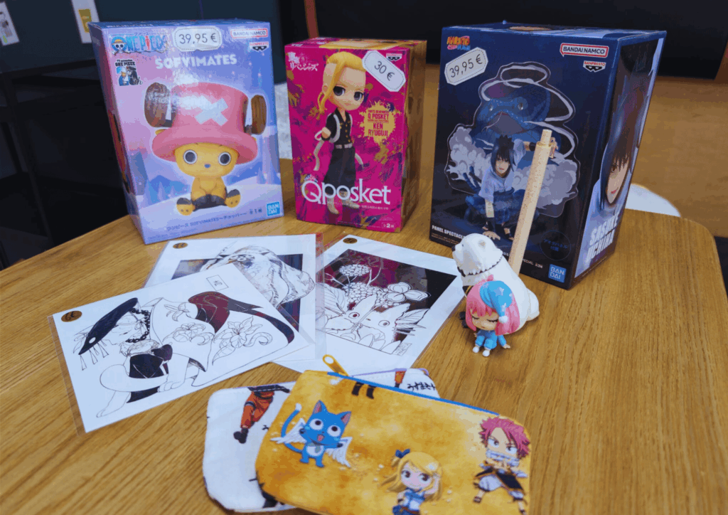 Vous trouverez dans cet espace un ensemble de produits dérivés de licences manga, des cartes chinoises et françaises à collectionner (Pokémon, One Piece etc…), ainsi que des œuvres d’artistes locaux en dépôt vente.